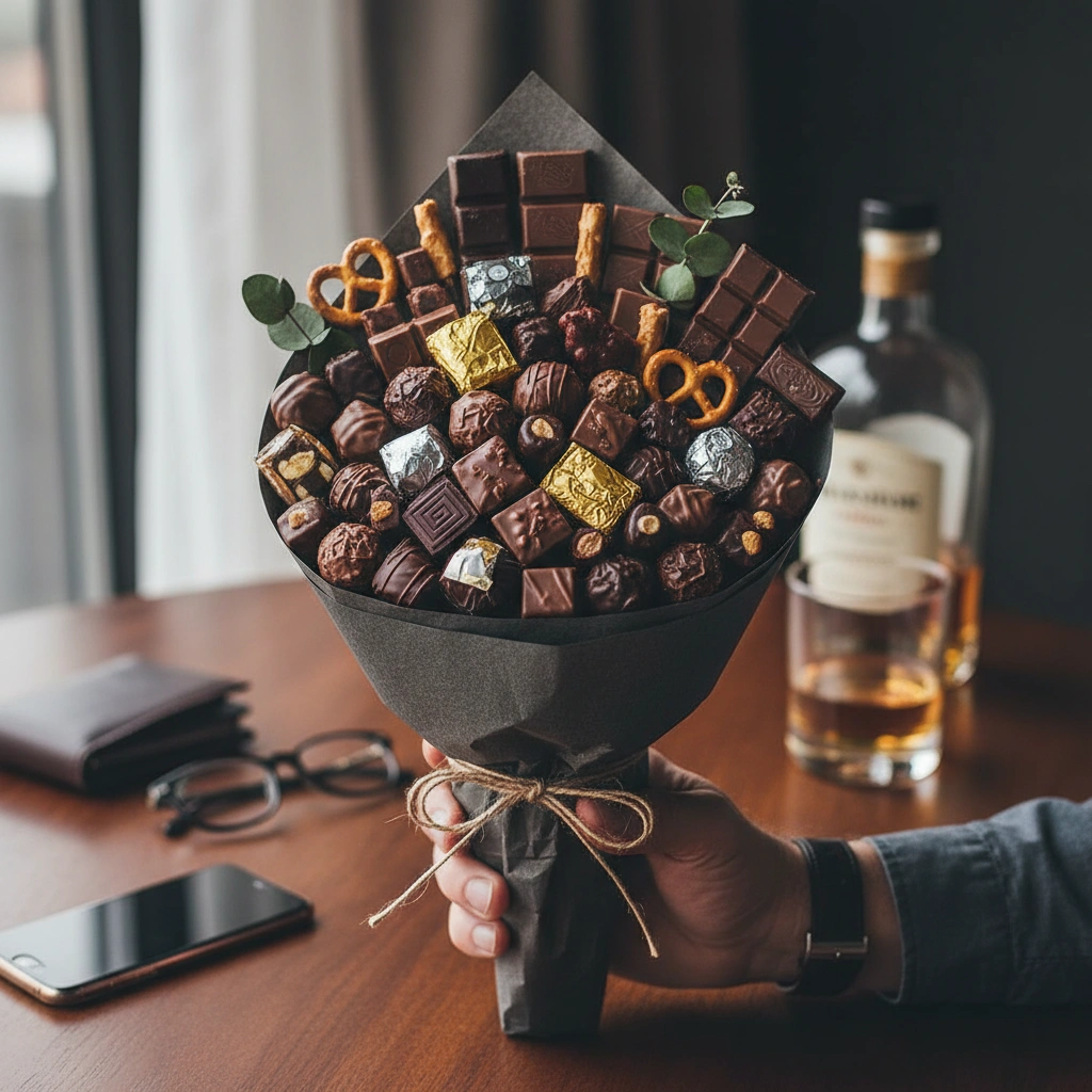 - לטיפוס המתוחכם: אם מדובר בגבר שמעריך איכות וטעמים עמוקים, לכו על זר המשלב פרליני שוקולד מריר איכותיים, שוקולדים עם אחוזי קקאו גבוהים או שילובים מעניינים כמו שוקולד עם צ'ילי או מלח ים.