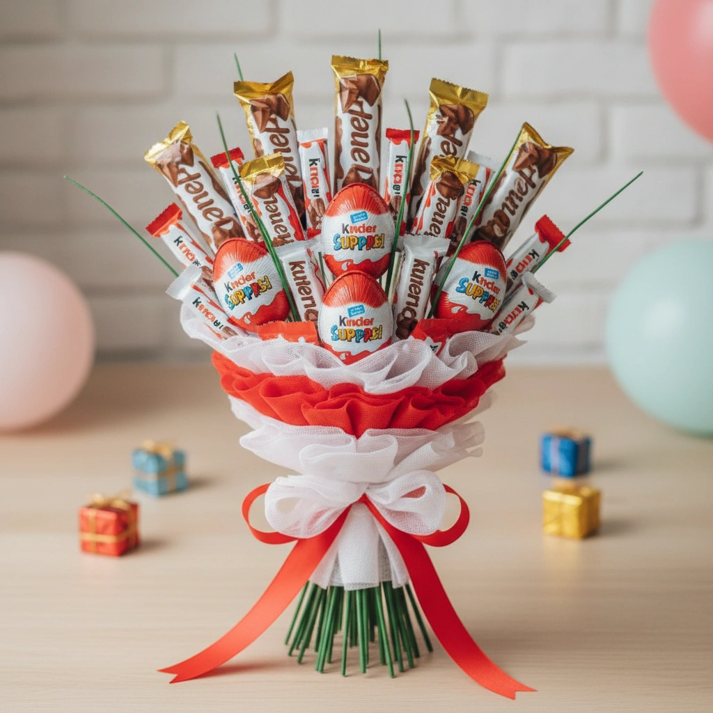 - פרלינים איכותיים: הוספת פרליני שוקולד גורמה (כמו פררו רושה או רפאלו) לצד ממתקי הקינדר מוסיפה נופך של יוקרה ואלגנטיות, ומתאימה מאוד למתנות למבוגרים.