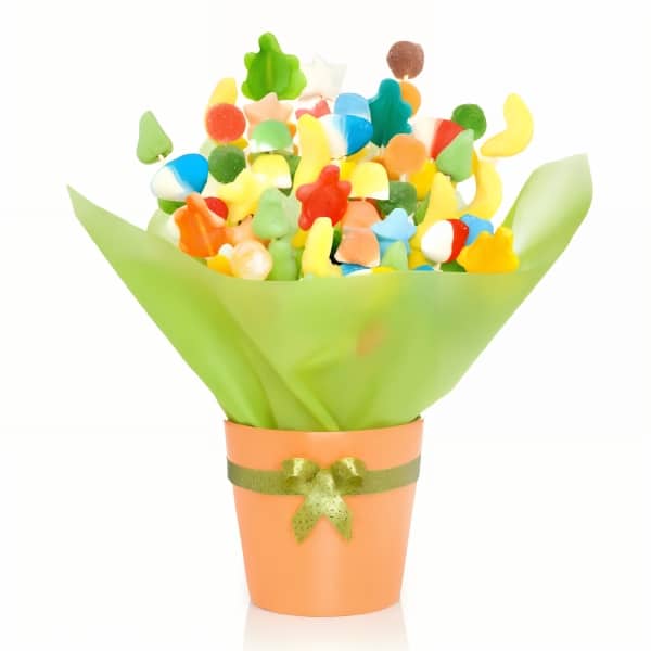 זר צבעוני ומשמח, מלא בסוכריות גומי טעימות וצבעוניות המשופדות בנימוס על 25 שיפודי גומי. כל הטוב הזה מונח בתפארת אל כלי צבעוני וחגיגי למראה. שימו לב כי גוון הכלי משתנה בהתאם למצאי, אך תמיד יוגש בכלי מהודר ובטוב מראה וטעם.