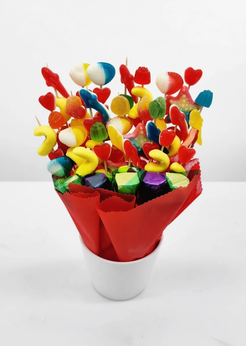 חגיגה של צבעים וטעמים בזר אחד! זר מתוק מתוק הוא פיצוץ של שמחה, המשלב 25 שיפודי גומי צבעוניים ו-5 פרחי שוקולד איכותיים, עטופים בעבודת יד. הזר מגיע בכלי חרסינה לבן עם עטיפה אדומה, ומהווה מתנה מושלמת ובלתי נשכחת ליום הולדת, חג, או פשוט כדי להמתיק למישהו את היום.