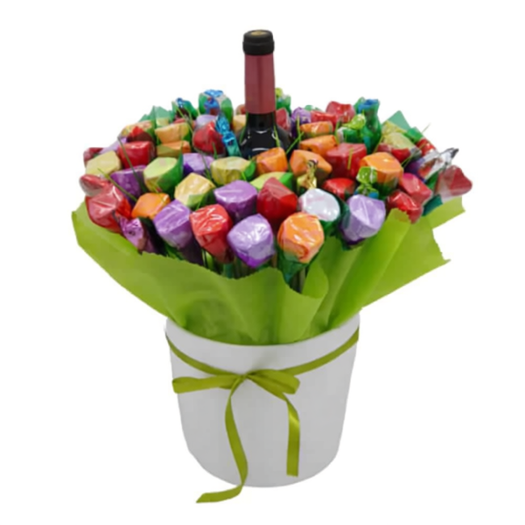 זר "איחולים בראש טוב" נראה כמרבד צבעוני המורכב מ-55 פרלינים – עטופים אחד אחד בשלמותם ובמראה של פרח צבעוני – וביניהם צצות ומבצבצות סוכריות שונות וצבעוניות כגון טופי, לבבות ושוקולדים. וכאמור, במרכזו של הזר, מונח בראש טוב בקבוק יין אדום מיקבי טפרברג – ניתן להחליף ליין לבן ע"פ בקשתכם. הזר מוגש בכד חרס גדול ומרשים, עטוף באופן ראוי ומכובד להפליא.